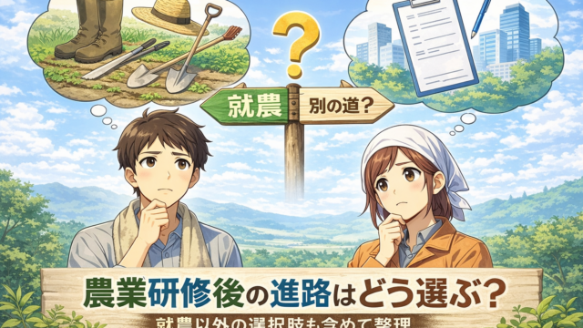 農業研修後の進路について、就農以外の選択肢も含めて整理。研修後に迷いやすい背景や考え方を、未経験者が判断材料として使いやすい形で解説します。